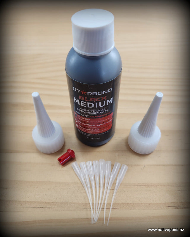 Starbond KE-150 Black Medium CA glue is a rubber-toughened, medium super glue that dries jet black in color. The black superglue is ideal for hiding imperfections, filling dark voids, and accenting specific areas in your projects. Starbond KE-150 Black Medium CA glue can also penetrate narrow slots, bond closely-fitted parts, quickly repair material, and be sanded down and polished to a high gloss finish. Starbond KE-150 Black Medium CA glue is commonly used in hobby for RC car tires, woodturning for inlays and spalted wood. It is important to keep in mind that the colored CAs have an extended bonding time due to the added rubber compound. Although bonding time is generally 30-60 seconds, it can take much longer to dry when larger volumes of the adhesive is applied. For these instances, use of Starbond Accelerator is highly recommended.